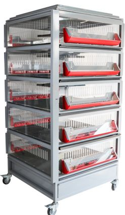 We first built two 2’ x 6’ cages that stack, and later bought a Chick Tower from Tractor Supply. The Chick Tower has 5 levels, each with about 9 square feet. Each level comes with a waterer, feeder, radiant heater, and slide-out poop tray. We made some modifications to the doors to allow more airflow and the floor to allow poop to easily fall. You can see the video about replacing the floor at https://youtu.be/Fdk1UpKlIz8.