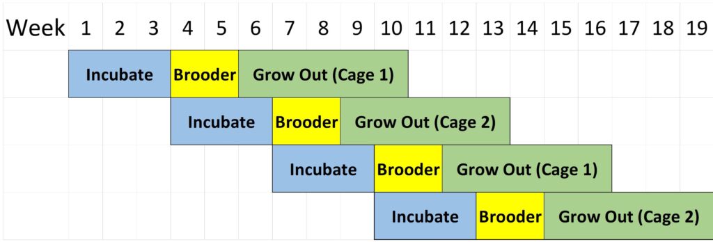With one incubator, you could incubate a group every 3 weeks. In a steady state, you would have 1 brooder, 1 cage for layers, and 2 cages for grow outs. The grow outs spend 2 weeks indoors, and 5 weeks outdoors. By the time the third group is ready to go outside, the first group is ready for processing, so you’ll have an open cage. And you’ll have more fresh meat every 3 weeks.