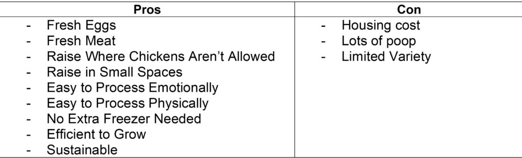 We learned a lot in our first year. We learned that quail are fairly easy to raise, are consistent layers, and taste great! And you can raise them in a garage or backyard. If you have considered raising quail, here are a few of the Pros and Cons of raising quail for food that you should be aware of.