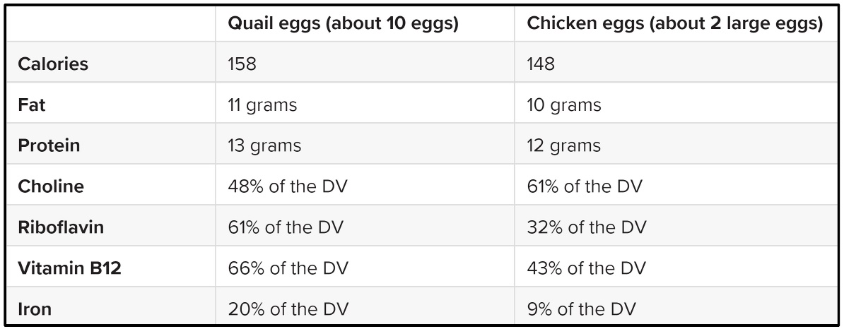 The taste is similar to chicken eggs, but with different nutrition. Ounce for ounce, quail eggs have less choline, but significantly more riboflavin, vitamin B12, and iron. Some people with egg allergies say they can eat quail eggs.
