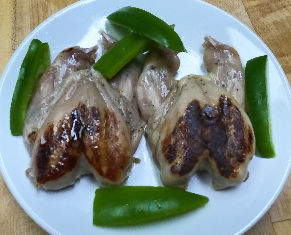 Pro #2 – Fresh Meat. Quail grow quickly. In just 7 to 8 weeks, they’re ready for processing. The final product is small (just ¼ pound), so you’ll probably want a couple for dinner. The meat is delicious. It’s all dark meat, and the taste is somewhere between chicken and duck. Quail is a game bird, but it doesn’t taste too gamey. And it’s not greasy like duck. It can be roasted, braised, or grilled. We like ours cooked on a grill press. Because they’re small, they cook quickly (15 minutes in the oven, 5 minutes on the grill press).