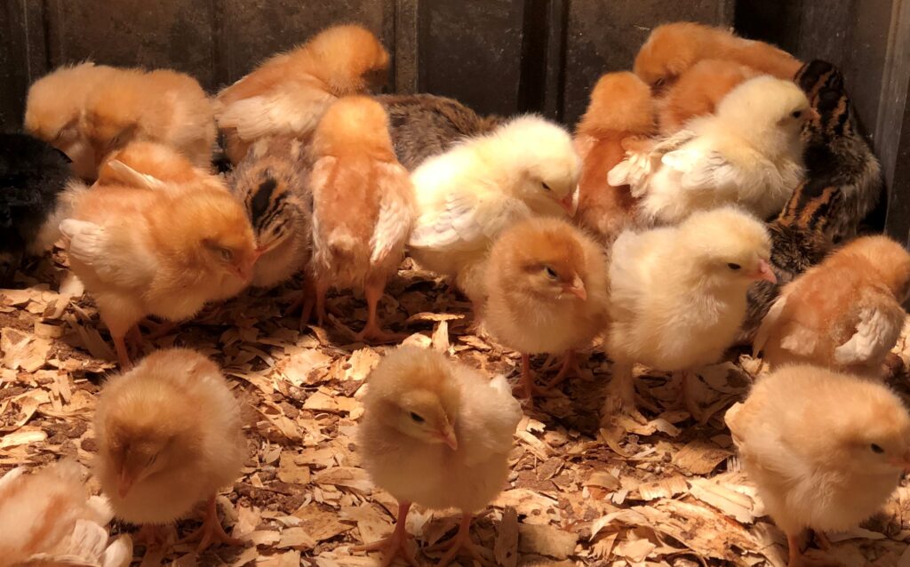 In addition to the heat source, your new chicks will need a feeder, a waterer, and some bedding. We recommend buying chick feeders and waterers, which are made to keep chicks safe and reduce waste and messes. For bedding, we recommend medium pine flake. It’s absorbent, inexpensive, and available at your farm store. We use wood blocks to raise the feeder and waterer above the pine flake. You’ll change out the bedding about once per week. Your nose will tell you when it’s time.